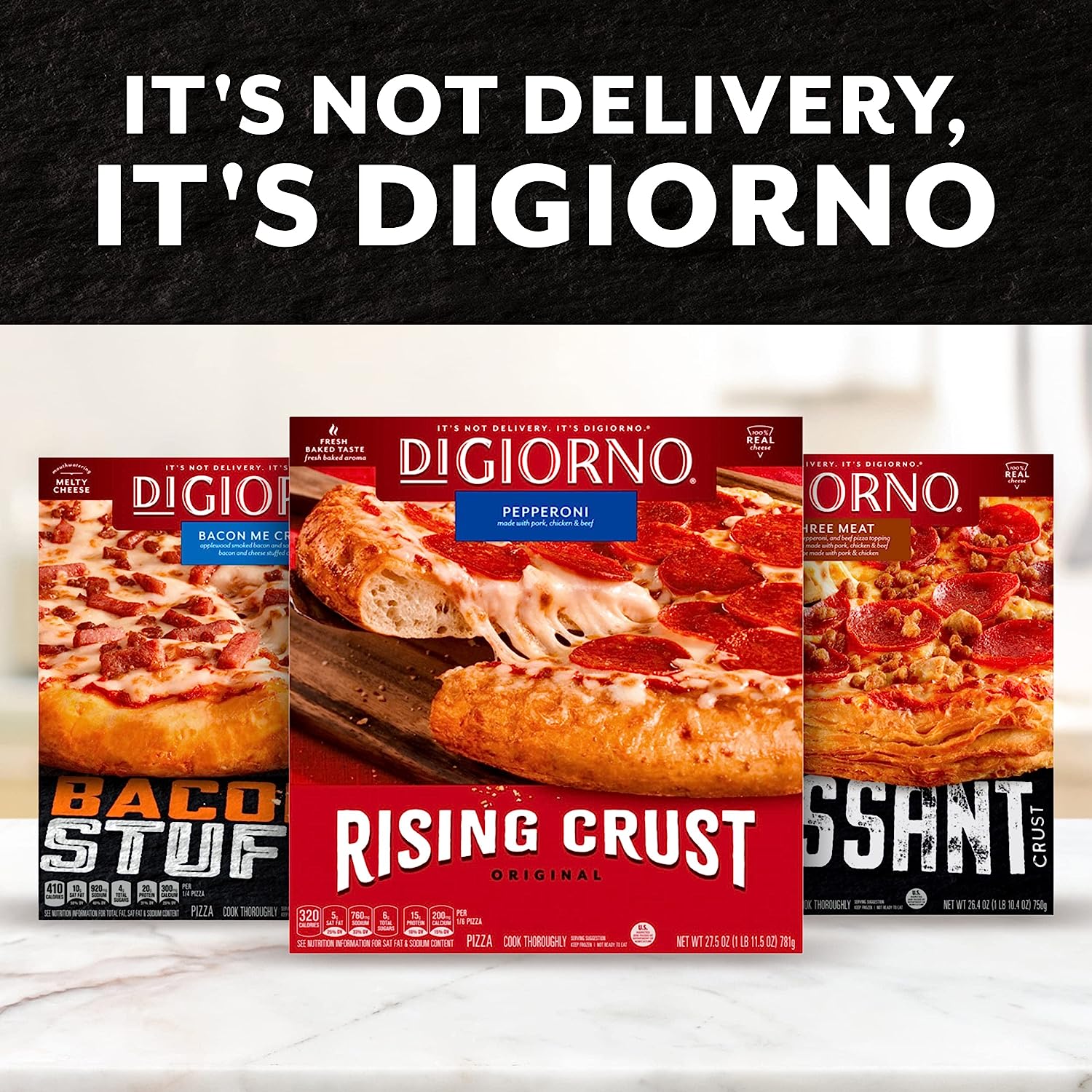 DiGiorno Pepperoni Frozen Pizza on a Rising Crust features a classic pizza topping combination on a delightful crispy rising crust. The DiGiorno frozen pizza is topped with pepperoni and mozzarella cheese, delivering an easy dinner that's also delicious. This cook and serve frozen DiGiorno pizza is made with 100% real cheese and DiGiorno signature tomato sauce. Step up your family dinner with a frozen pepperoni pizza on busy weeknights, or enjoy a pizza party with family or friends, or cook for a quick lunch. Keep this pepperoni pizza frozen until you're ready to enjoy. It's not delivery. It's DiGiorno.
