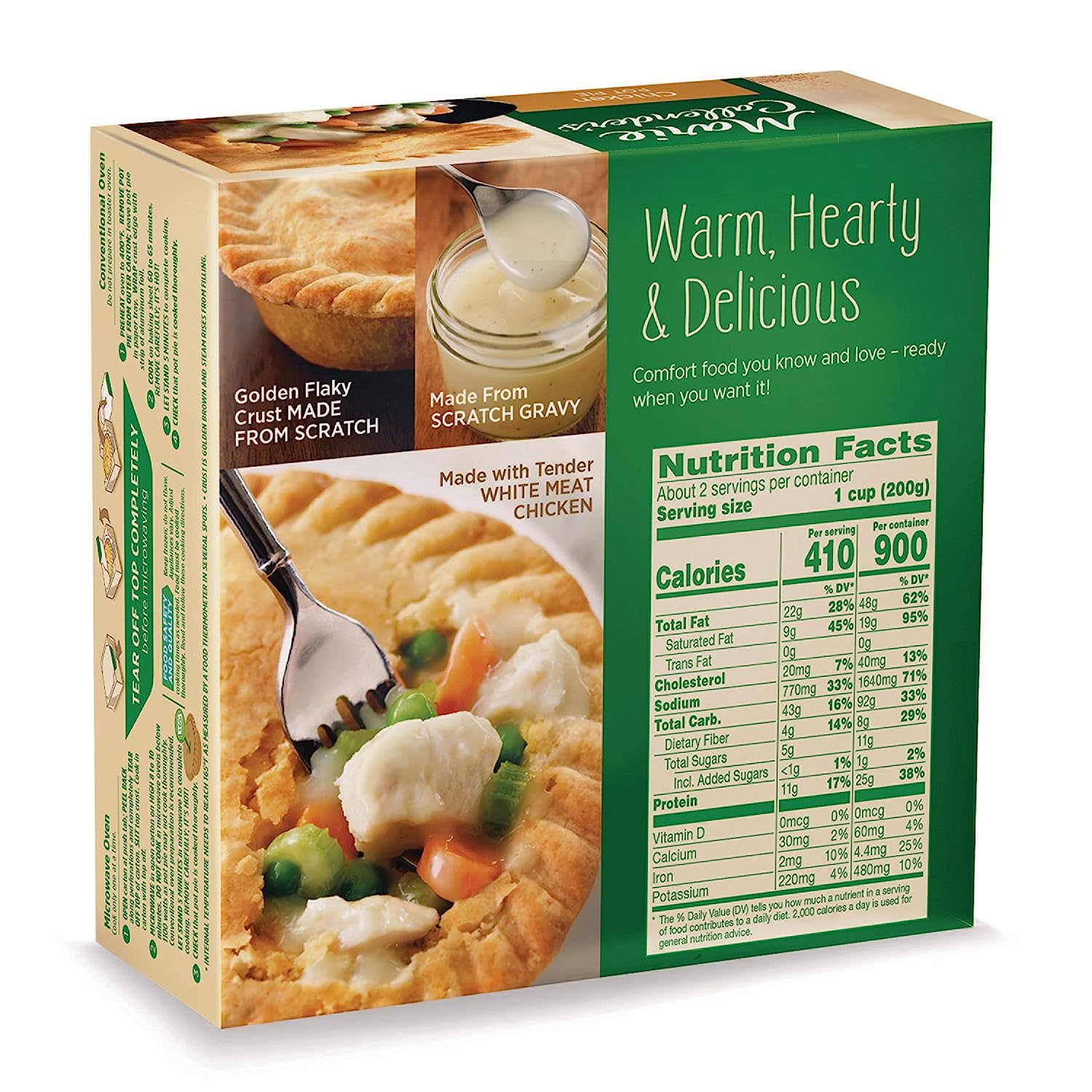 Warm up with a delicious, comforting Marie Callender's Chicken Pot Pie. Made with tender white-meat chicken, savory vegetables, and made-from-scratch gravy - all wrapped in a golden, flaky crust. With 11 g protein per serving, and no preservatives, artificial colors, or artificial flavors, this convenient meal can be microwaved or heated in the oven. Enjoy this warm, hearty, and delicious comfort food today.