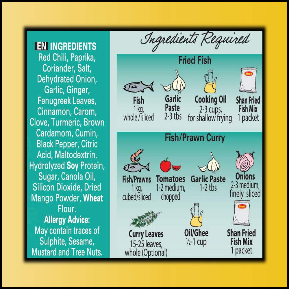 - Quantity- Shan Fried Fish Recipe and Seasoning Mix comes packaged and sealed in a box containing a packet of 50g of spices.
