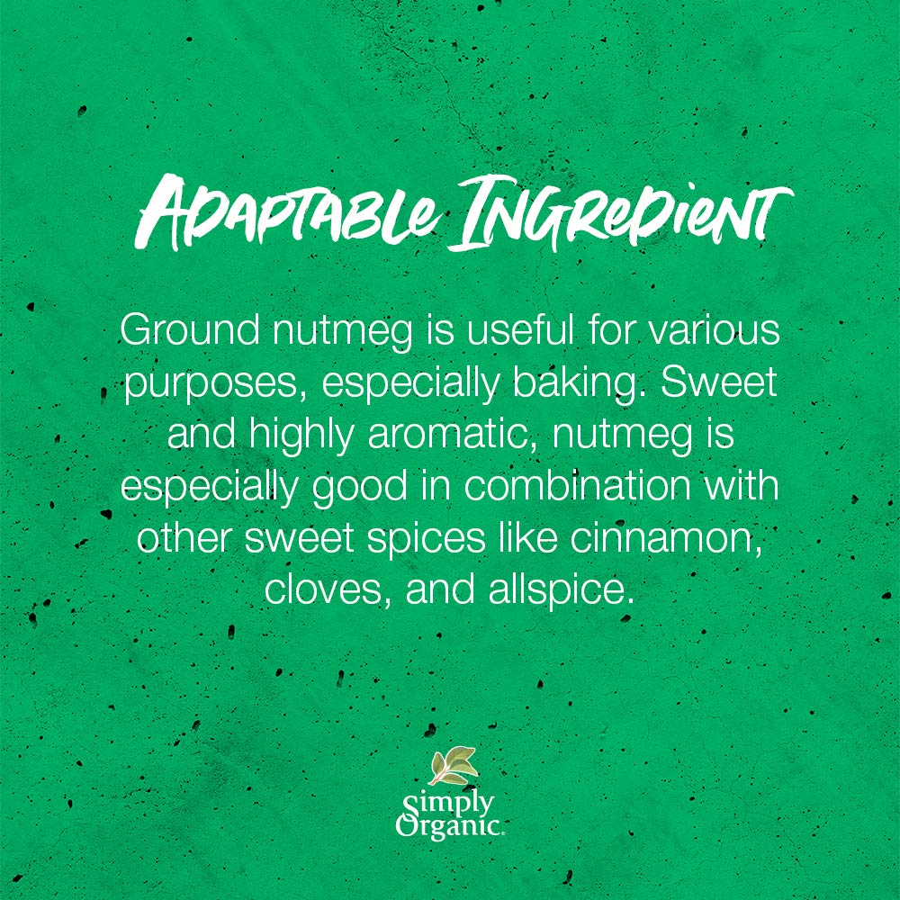 - ADAPTABLE INGREDIENT - Ground nutmeg is useful for various purposes, especially baking. You can also sprinkle it into your smoothies. Add it to cooked greens, Greek dishes, cream sauces and sweet potatoes - the list goes on.